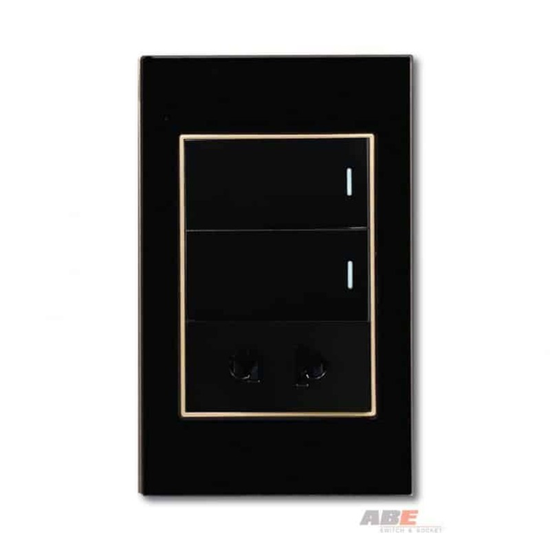 Công tắc đôi kèm Ổ cắm đơn Kính đen có bề mặt được làm bằng kính cường lực đen cao cấp kết hợp với hạt phụ kiện công tắc điện – Ổ cắm điện màu đen.
