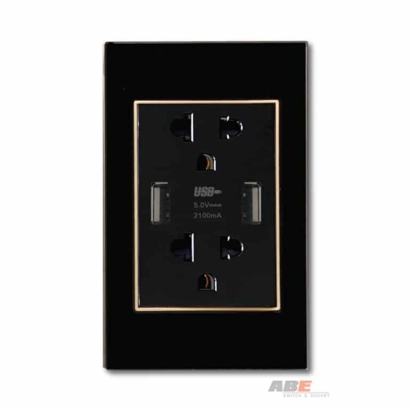 Ổ cắm đôi 3 chấu kèm USB đôi Kính đen có bề mặt được làm bằng kính cường lực đen cao cấp kết hợp với hạt phụ kiện công tắc điện – Ổ cắm điện màu đen.