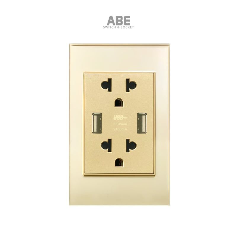 Ổ cắm đôi 3 chấu kèm USB đôi Crystal Gold có bề mặt được làm bằng kính cường lực vàng cao cấp kết hợp với hạt phụ kiện công tắc điện – Ổ cắm điện màu vàng