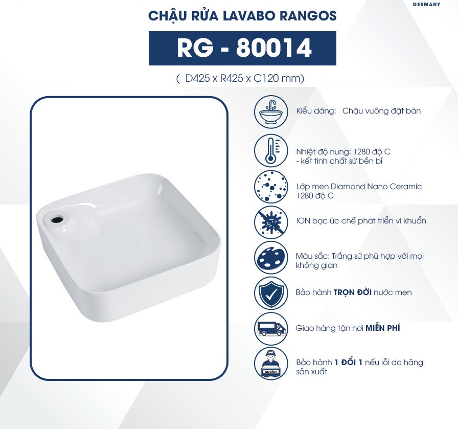 - Chậu lavabo đặt bàn Rangos RG-80014 thiết kế chậu vuông kết hợp màu sắc trắng sứ với độ sáng bóng vượt trội mang đến không gian đầy sang trọng.