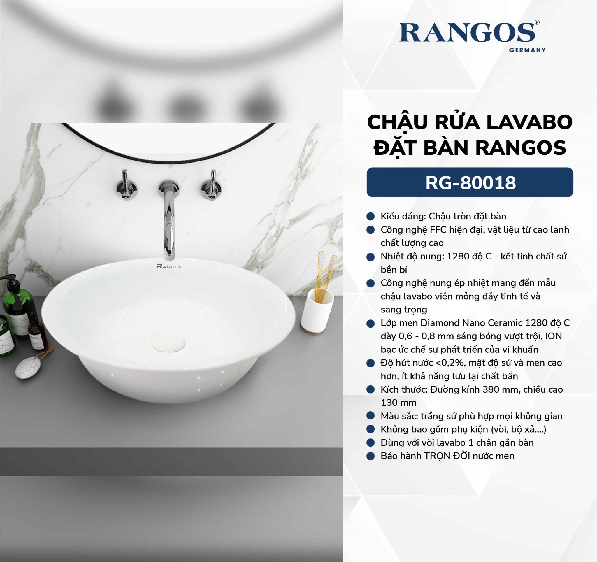 - Chậu lavabo đặt bàn Rangos RG-80018 thiết kế hình tròn, kết hợp màu sắc trắng sứ với độ sáng bóng vượt trội mang đến không gian đầy sang trọng.