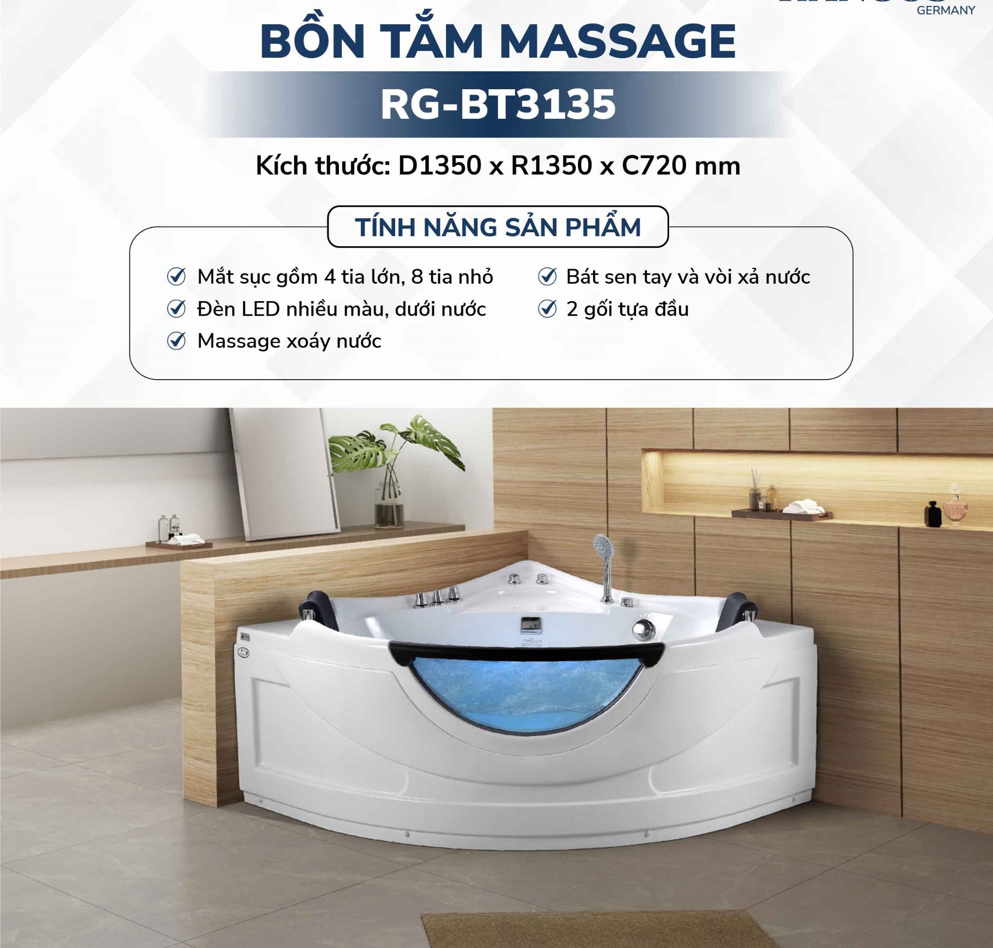 - RG-BT3135 bao gồm hệ thống mắt sục 4 tia lớn + 8 tia nhỏ kết hợp tạo nên xoáy nước massage với lực tác động tự nhiên của dòng nước đến các vị trí cần thư giãn trên cơ thể bạn như: Lưng, hông, đùi, … các cơ bắp dường như được thả lỏng và thư giãn tối đa góp phần chữa lành và khôi phục tinh thần 1 cách nhanh chóng nhất.