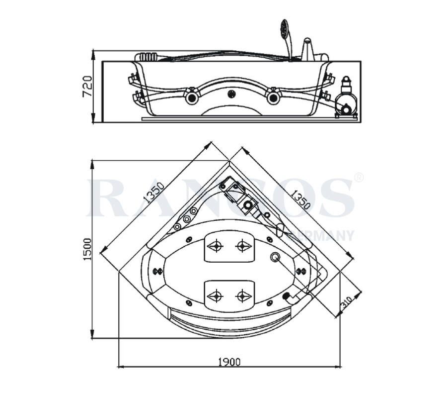 Bồn tắm massage cao cấp Rangos RG-BT3135 thiết kế bồn đặt góc tiết kiệm không gian