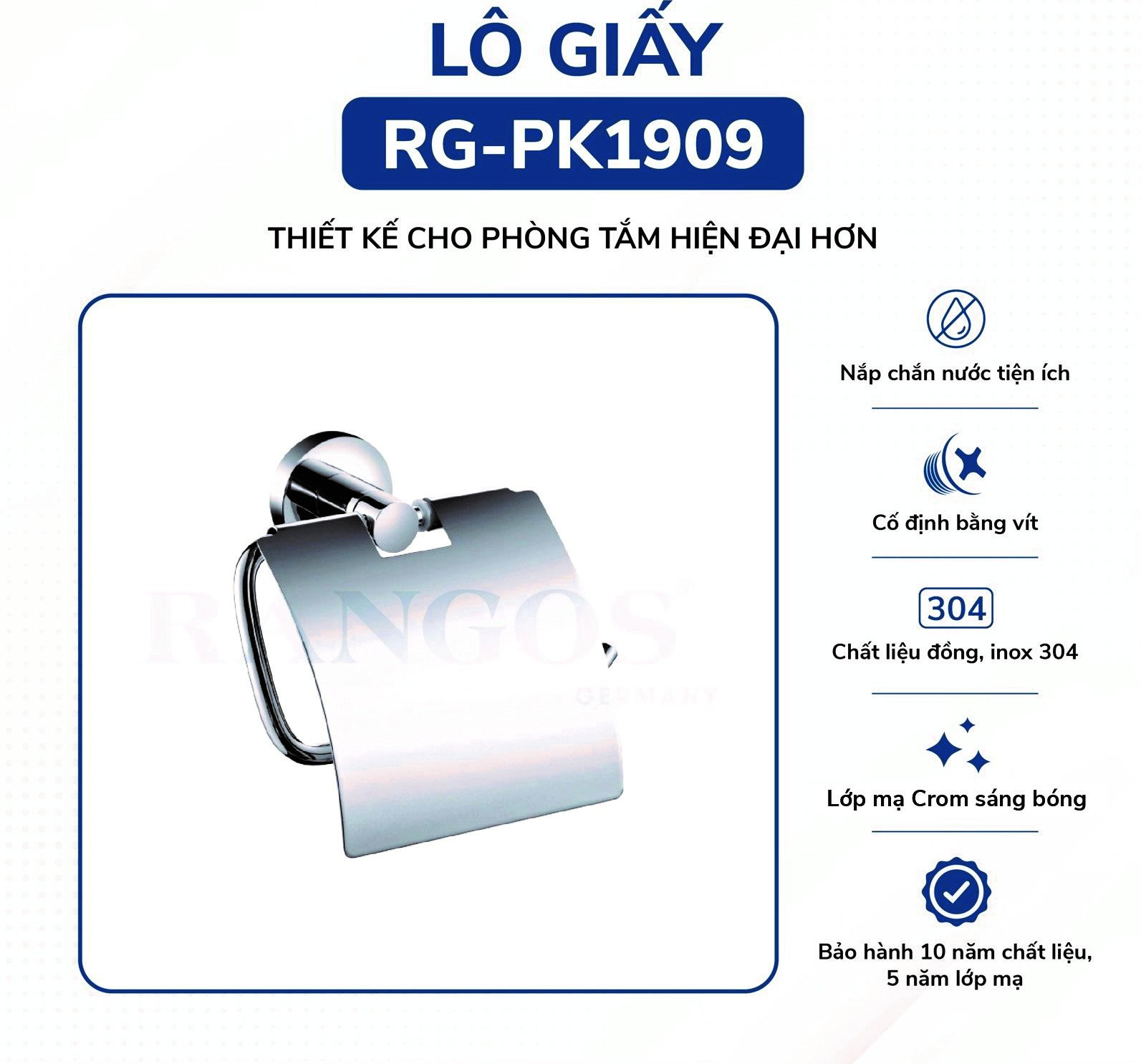 - Lô giấy cao cấp RANGOS RG-PK1909 được làm từ chất liệu đồng cao cấp và inox 304 - một loại thép không gỉ, được dản xuất với mục đích nâng cao khả năng chống ăn mòn (đặc biệt ở các mối hàn) khi tiếp xúc với nhiều loại hóa chất khác nhau. Bên cạnh đó inox 304 còn có khả năng chịu nhiệt tuyệt vời giúp vật liệu có tính đa dạng và bền bỉ vượt trội hơn.