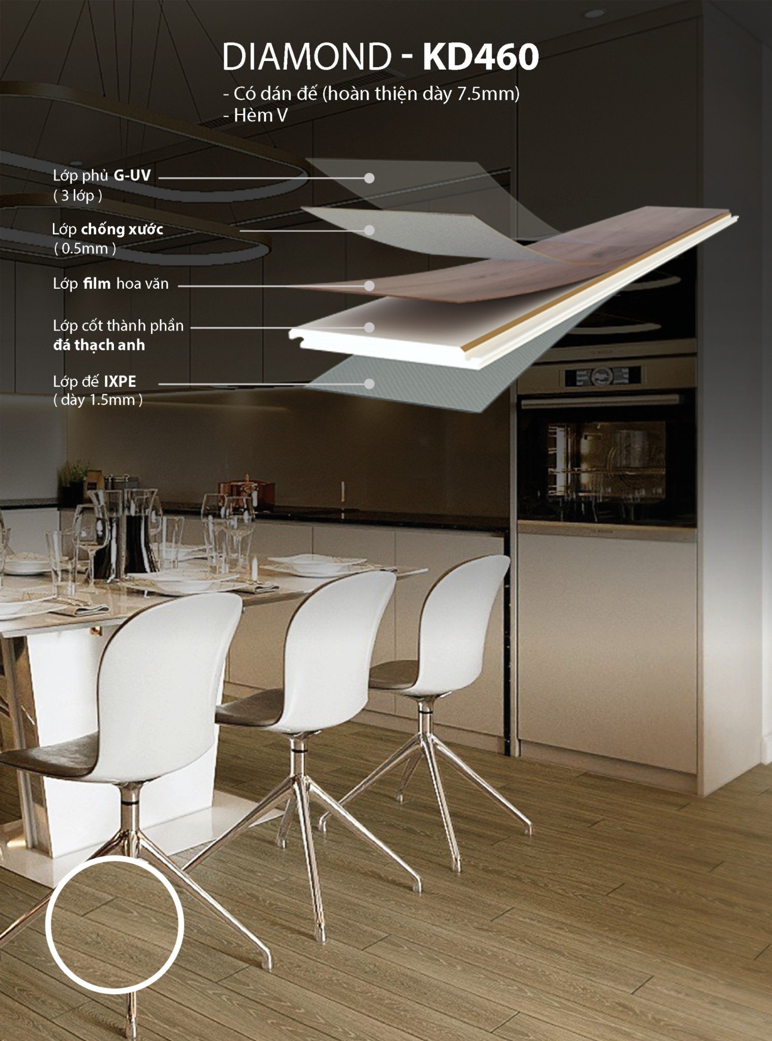 - Lớp cốt thành phần đá thạch anh: Độ bền thả rơi cao lên tới trên 1600mm (theo tiêu chuẩn EN 13329 của Châu Âu). Thành phần đá thạch anh tăng cường năng lượng, thịnh vượng phong thủy.