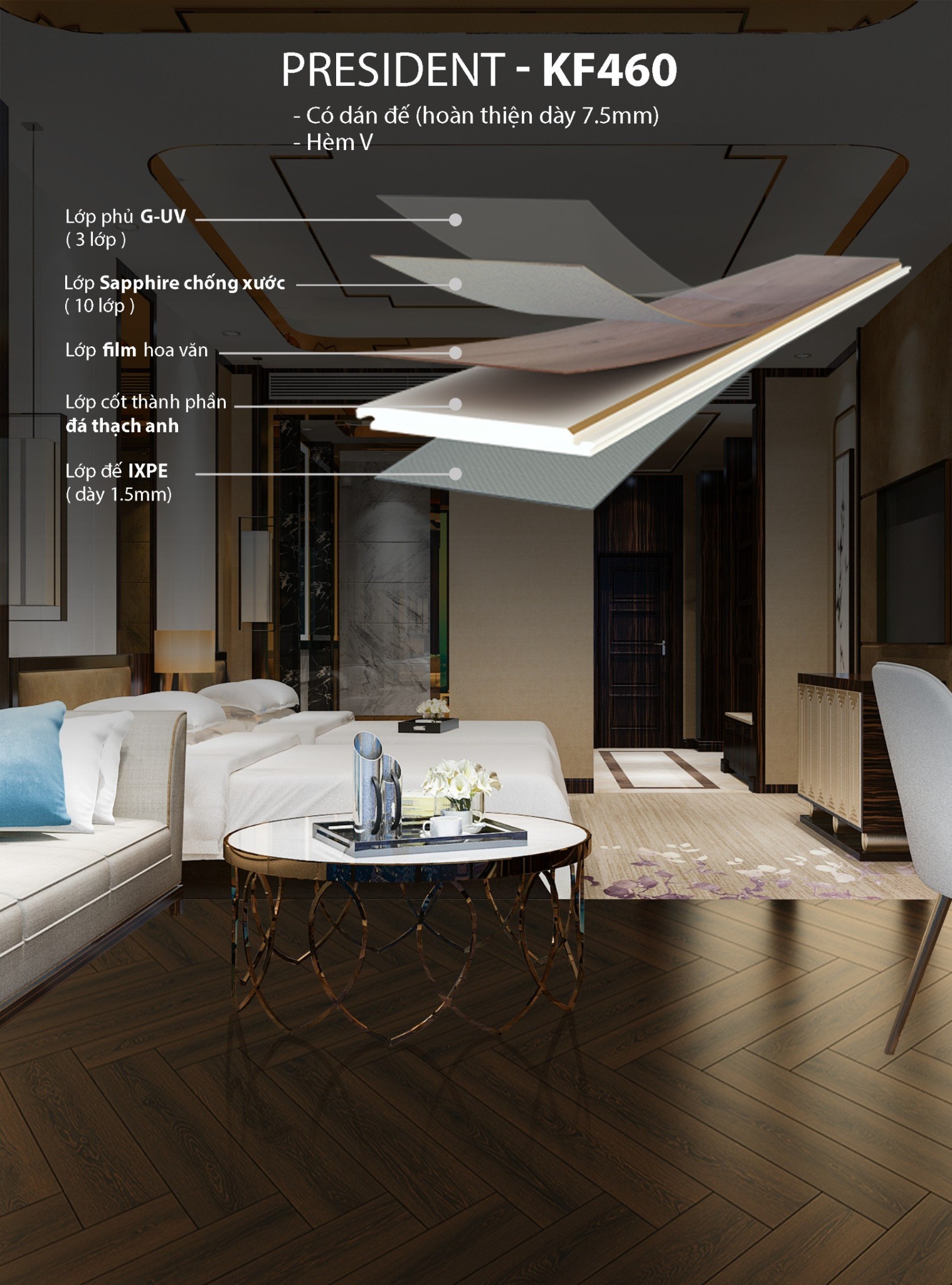 - Lớp Twin Sapphire: Bề mặt trên cùng của tấm sàn sẽ được phủ hai tấm đá Sapphire, ở giữa là lớp PVB đặc biệt có sức chịu lực lên tới 500kg/cm2 và chịu nhiệt tới 700 độ C. PVB còn có tác dụng chống bom đạn trên kính ô tô tổng thống. Nhờ vậy, bề mặt sàn có khả năng chống xước hoàn hảo, chống tia UV, chịu lực tốt gấp nhiều lần
